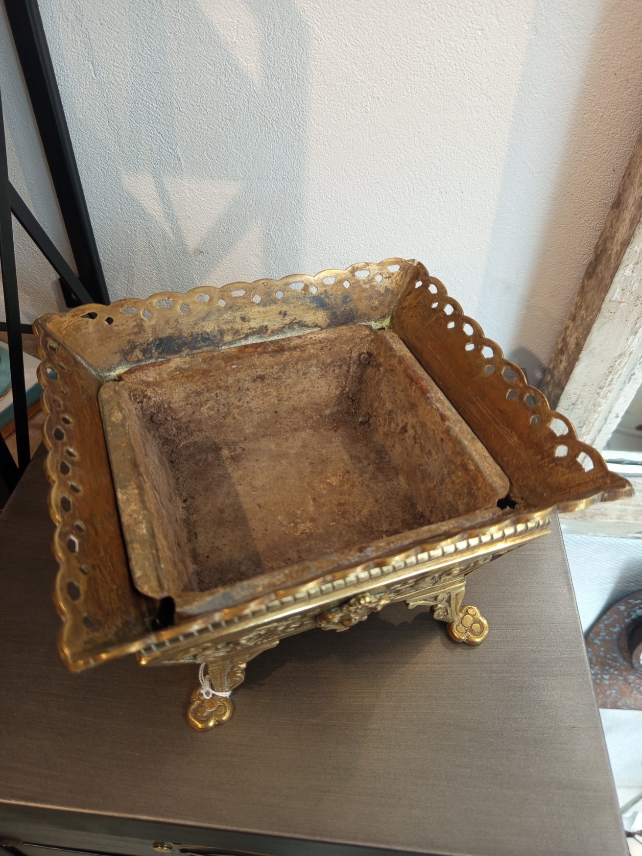 Belle monture de jardinière en bronze du XIXème avec un décor ajouré. Bel objet de décoration en bon état, à l’intérieur se trouve un réceptacle en zinc. Ce cache-pot pourra accueillir vos plantes préférées ou devenir un charmant vide-poche par exemple.
