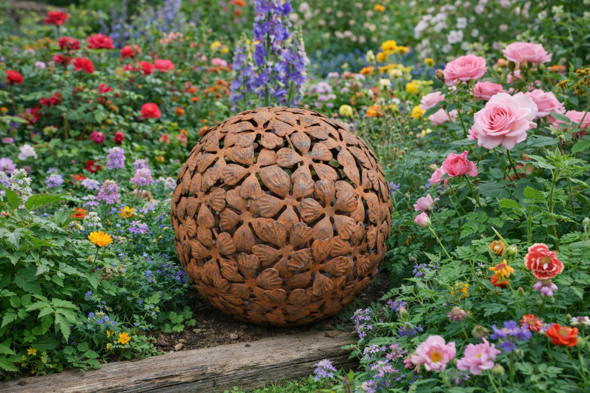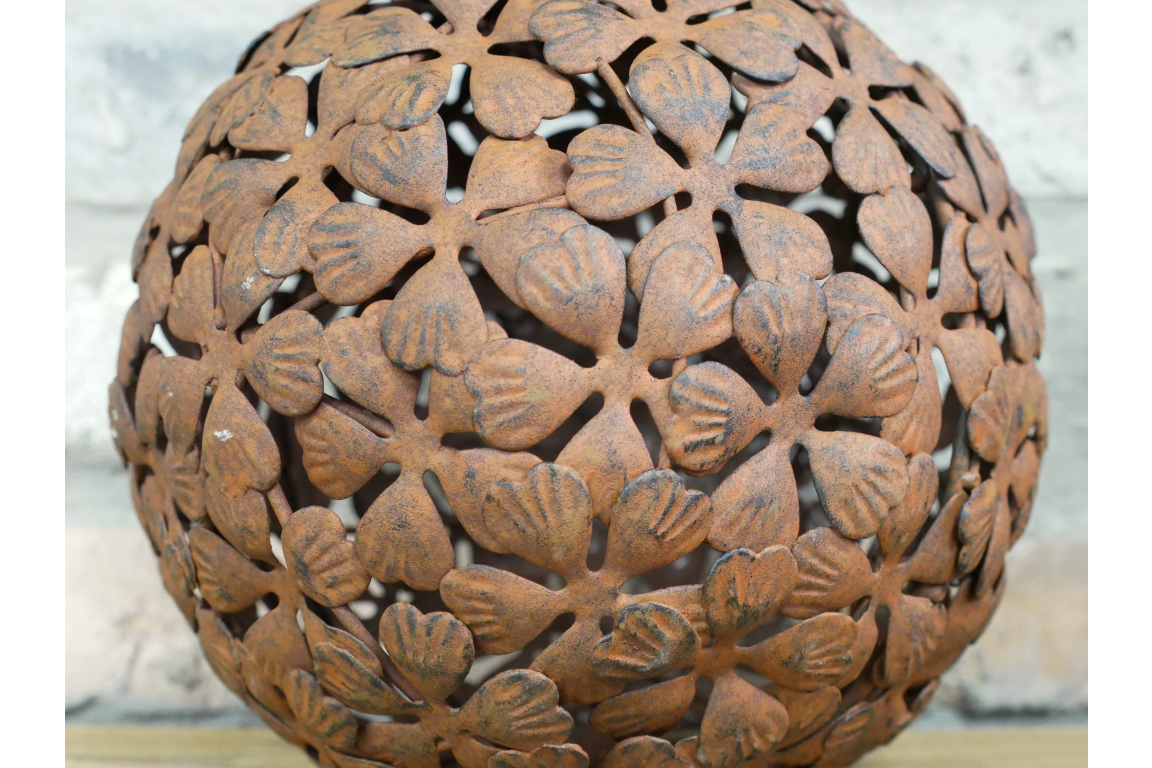 Boule décorative en métal façon rouillée. Cette boule avec un décor d’innombrables fleurs peut trouver sa place dans votre intérieur comme dans votre jardin. La finition rouillée donne un aspect ancien, brocante. Vous trouverez d’autres boules de décoration dans différentes tailles sur ce site.