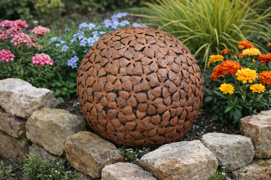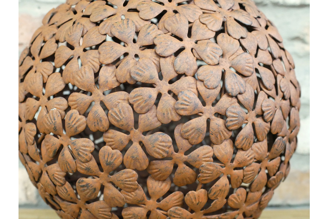 Boule décorative en métal façon rouillée. Cette boule avec un décor d’innombrables fleurs peut trouver sa place dans votre intérieur comme dans votre jardin. La finition rouillée donne un aspect ancien, brocante. Vous trouverez d’autres boules décoratives de différentes tailles sur ce site.