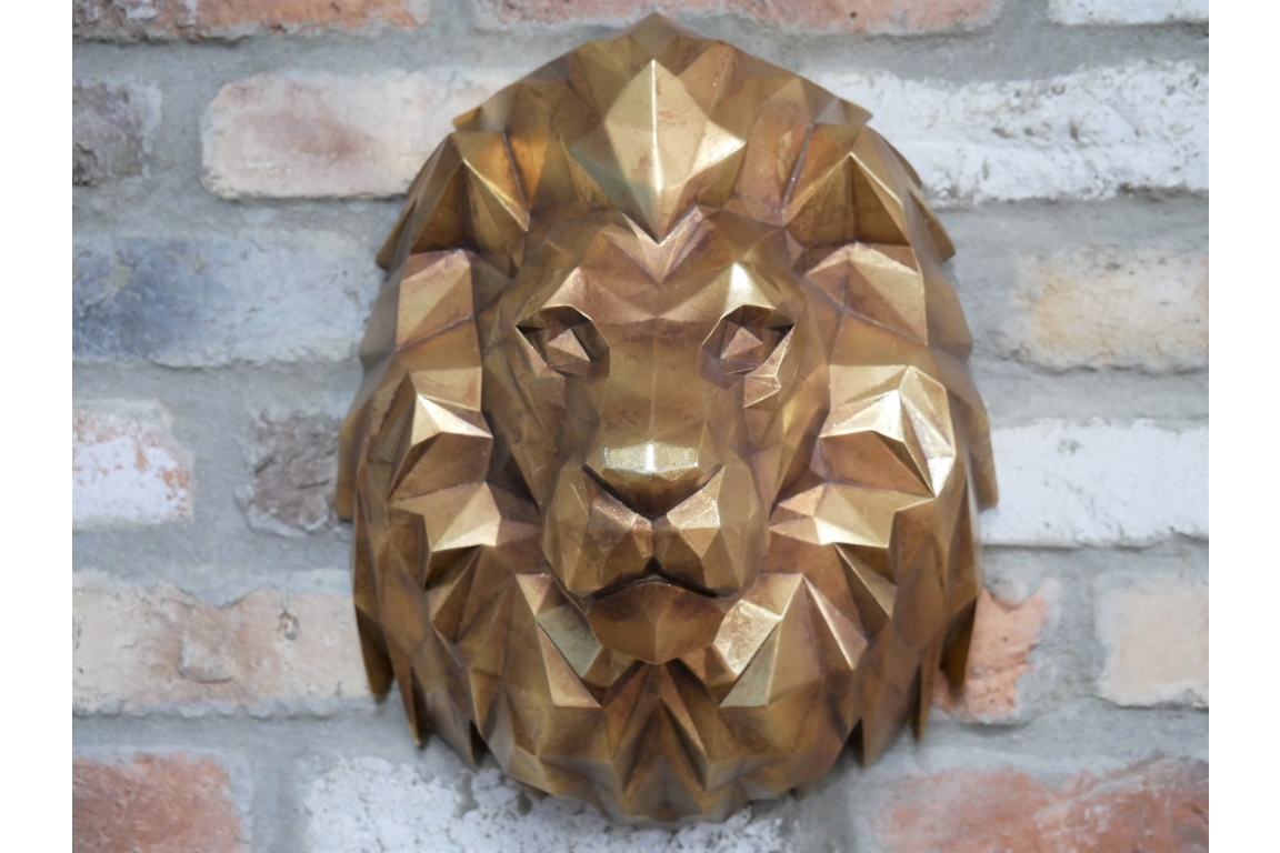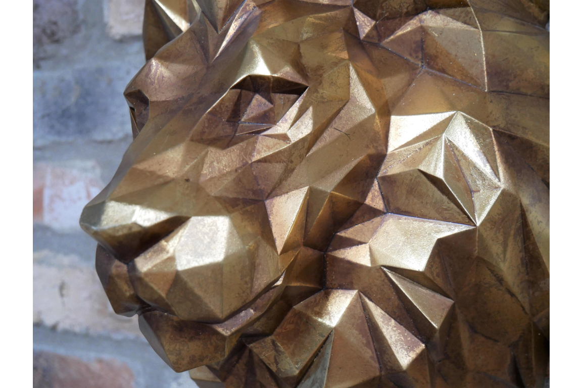 Décoration murale tête de lion dorée, finition vieillie. Cette tête de lion avec son design géométrique en résine est une belle décoration murale contemporaine pour un intérieur moderne.