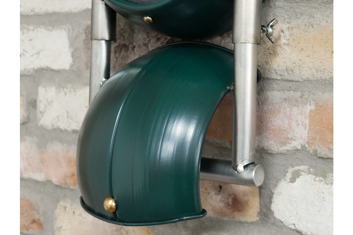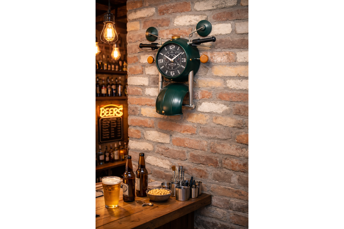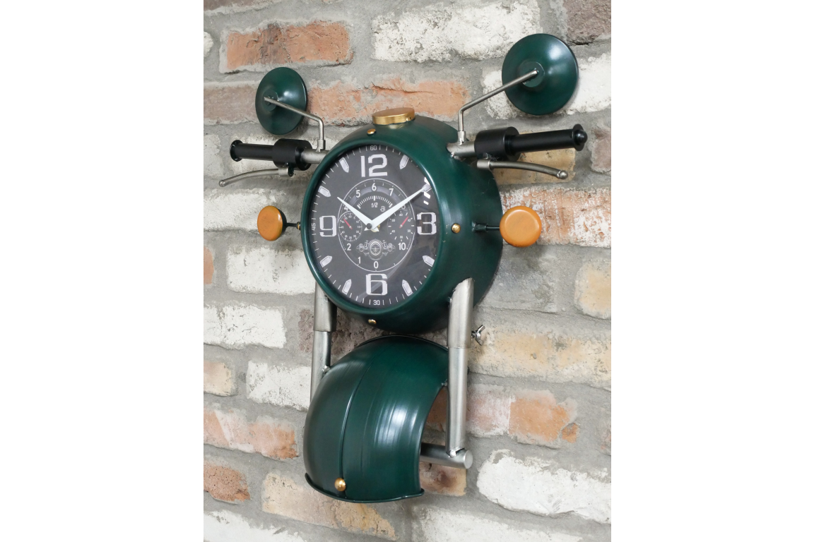 Horloge murale comme l’avant d’une moto. Cette horloge qui est en même temps une belle décoration murale est en métal. La présence des clignotants, des poignées, des rétroviseurs et leviers font de cette horloge une jolie décoration vintage.