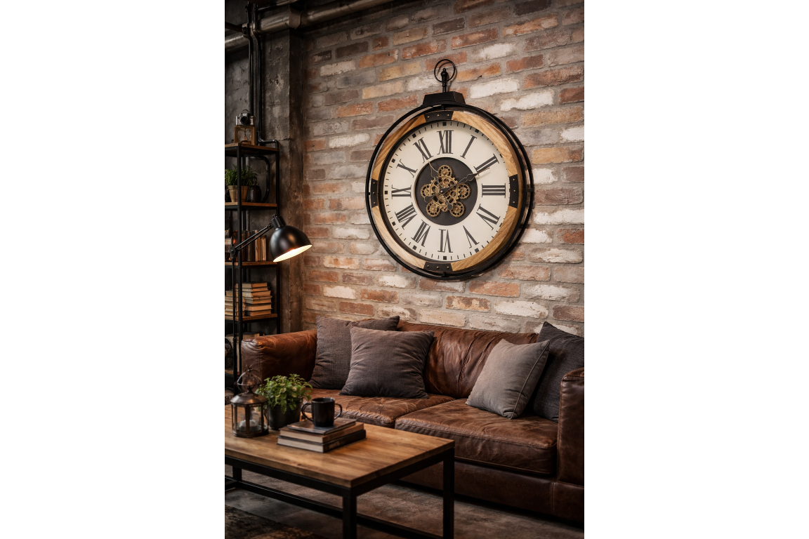 Horloge murale ronde avec double cadre en bois et métal forme gousset. Très belle déco murale avec au centre des engrenages comme décoration.