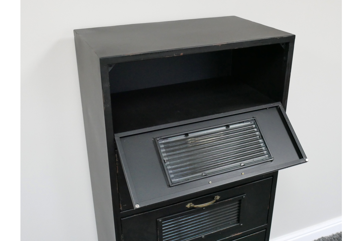 Meuble en métal avec cinq abatants vitrés avec une finition vieillie et un décor riveté, pour un aspect ancien, brocante, vintage. Ce meuble peut trouver sa place dans votre salon, entrée ou cuisine.