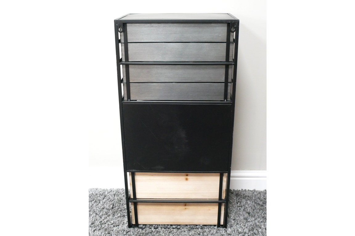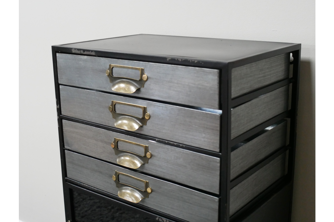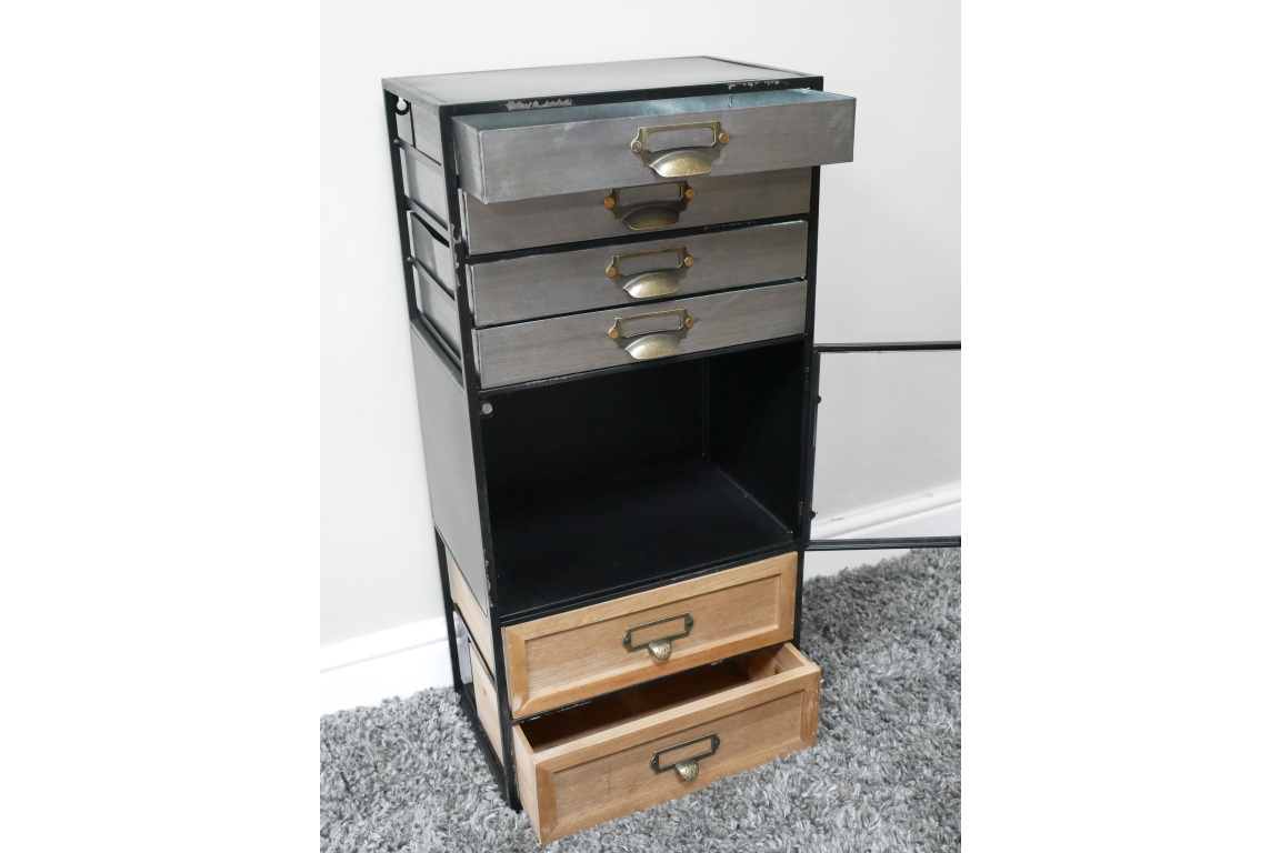 Meuble mural avec porte vitrée et tiroirs. Quatre tiroirs sont en métal et deux sont en bois. Le métal noir avec une finition vieillie et le bois brut donnent un bel aspect industriel, vintage. Un meuble idéal pour ranger les papiers au bureau ou pour le salon en mettant derrière la porte vitrée des objets en valeur. On peut le poser sur un meuble, directement au sol, ou l’accrocher au mur avec les fixations visibles sur les photos.