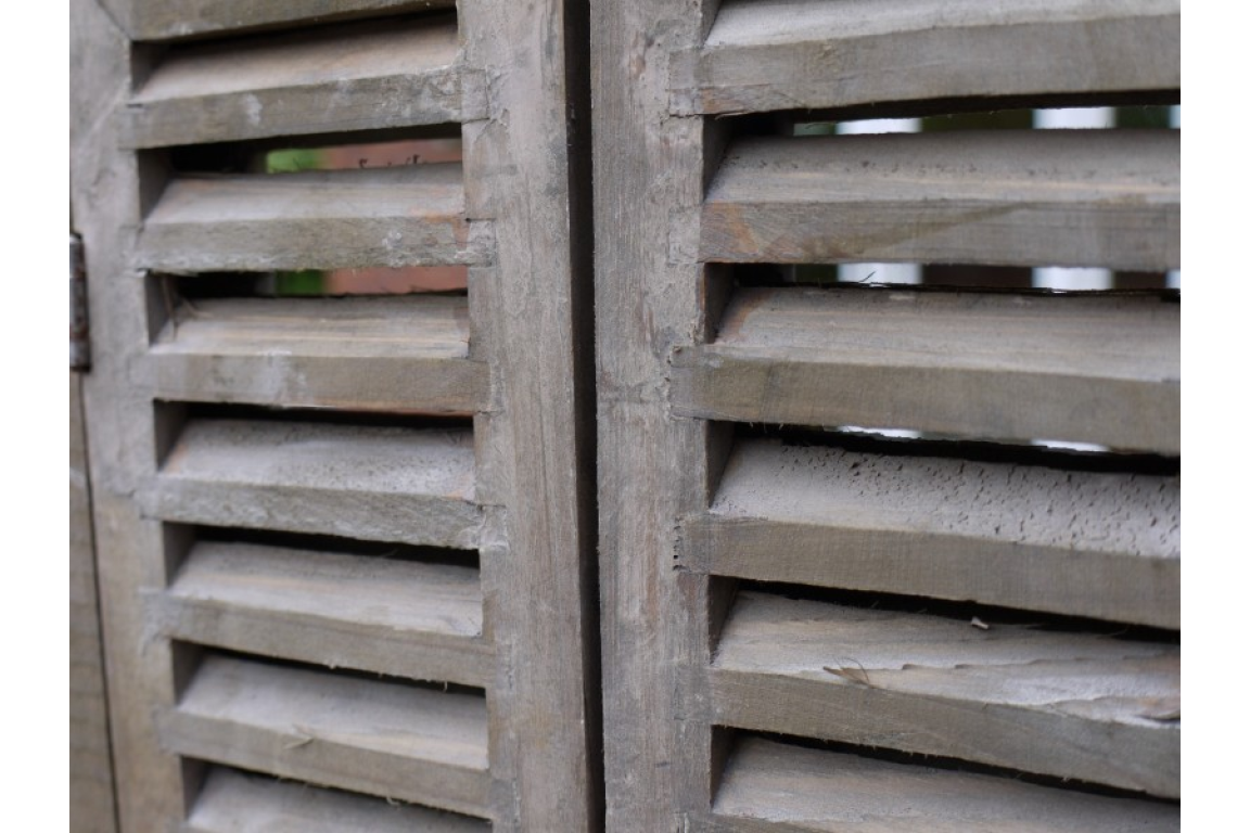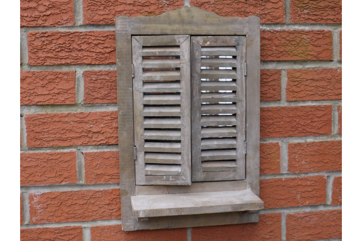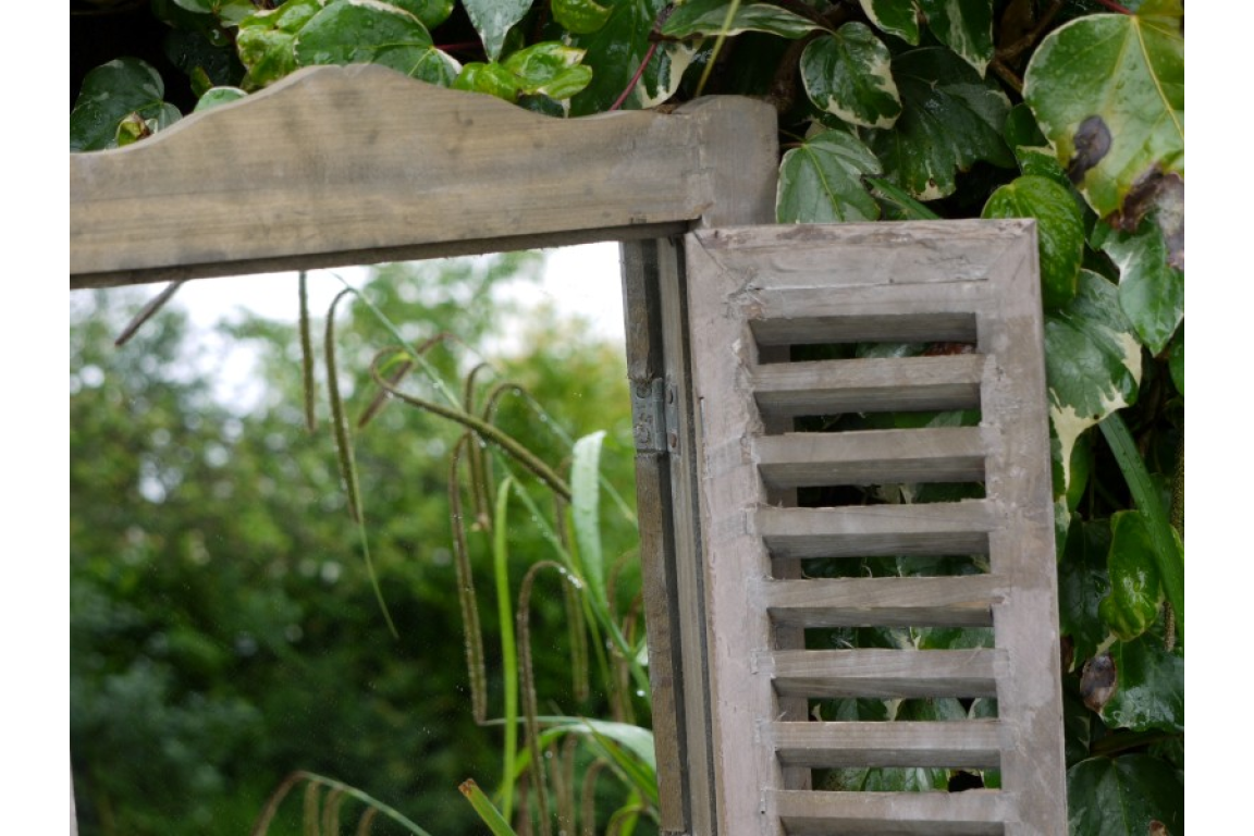 Miroir mural en forme de fenêtre ouverte avec une étagère. Une belle décoration murale, vous pouvez fermer les deux volets. Avec la finition vieillie ce miroir donne un bel aspect ancien, brocante.