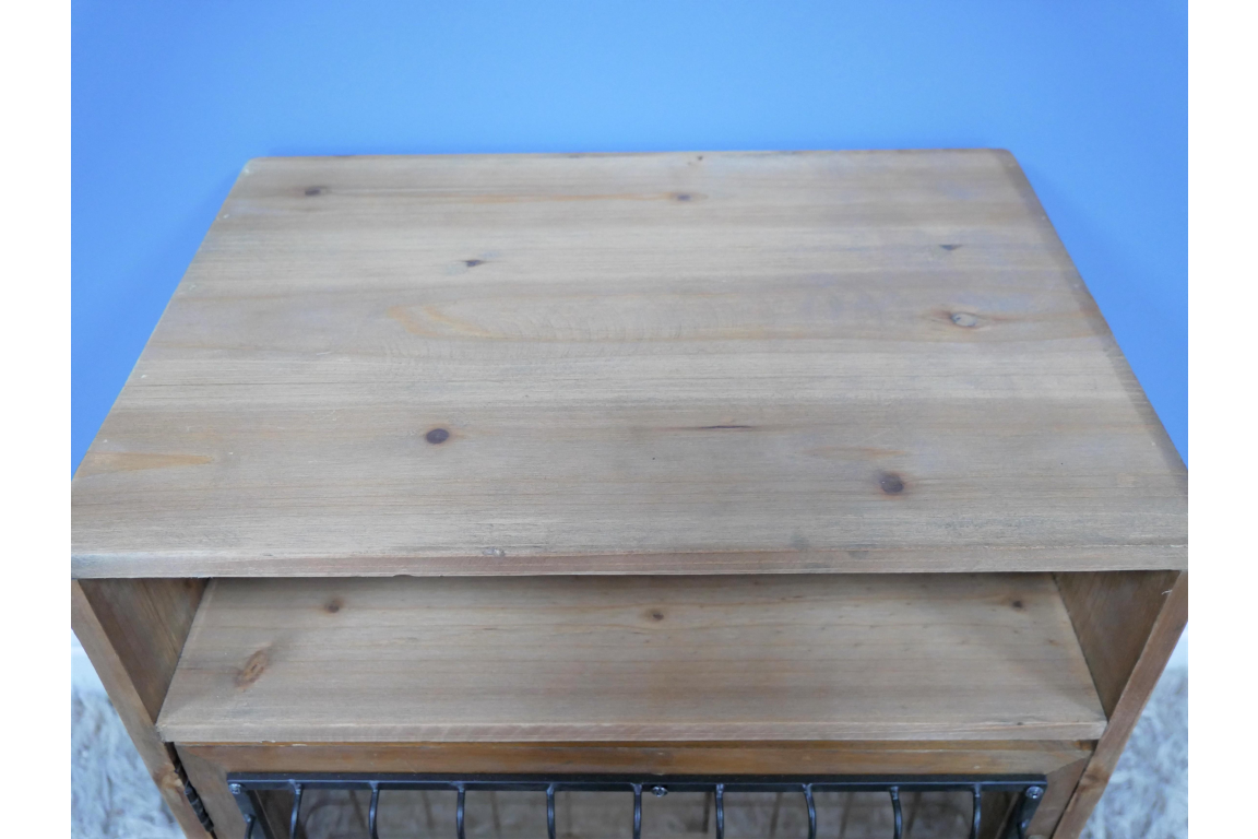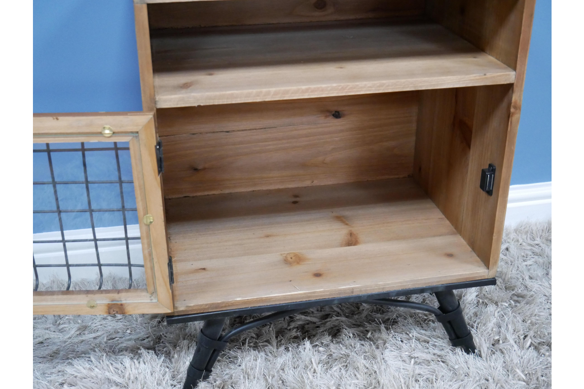 Petit meuble d’appoint en sapin et métal avec une porte vitrée et un compartiment. Le bois brut, le grillage sur la porte et les pieds en métal donnent un aspect industriel très réussi. Ce meuble peut trouver sa place dans un salon ou dans une chambre comme chevet.