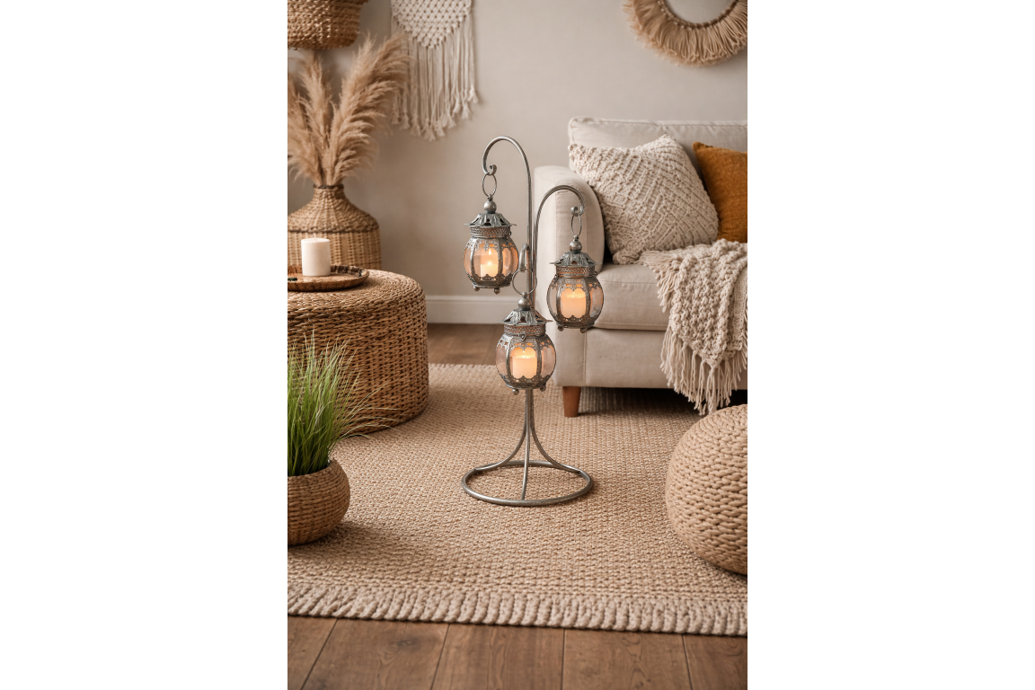 Pied avec 3 petites lanternes suspendues. Cette lanterne en métal avec une finition vieillie pour un aspect ancien, brocante est une belle décoration pour votre intérieur. La partie haute de chaque lanterne s’ouvre pour allumer ou changer la bougie.